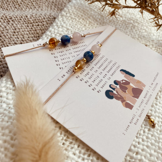 Zit verpakt om een kaartje waar de werking in affirmatie vorm op staat. Leuk om het kaartje bijvoorbeeld in je portemonnee te bewaren.