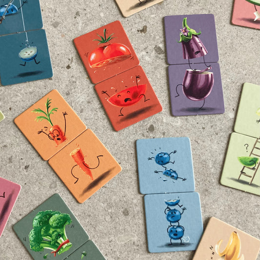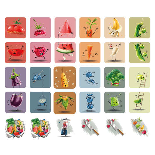 Het concept: Help! De fruit en groenten vrienden zijn door een groot, scherp mes in twee stukken gesneden. Ze zitten diep in de puree. Helpen jullie hun onderkant terug te vinden? Een fruitig geheugenspelletje met 2 moeilijkheidsniveaus om zowel jongere als oudere spelers te bekoren.