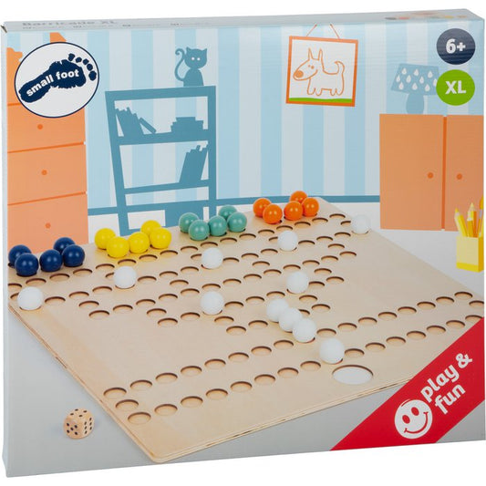 Spanning, geluk en tactiek! In deze klassieke houten bordspel in XL-formaat moet je barricades opzetten, tegenstanders eruit gooien en de tactisch beste manier vinden om je doel te bereiken. Maar pas op: andere spelers kunnen de weg blokkeren met witte knikkers! Het extra grote speelveld en de uitsparingen voor de stukken maken het voor spelers met kleine handen of onvaste handbewegingen gemakkelijk om de stukken te plaatsen.