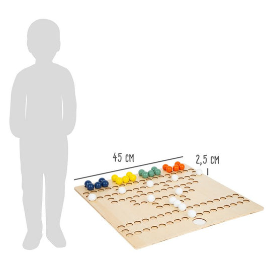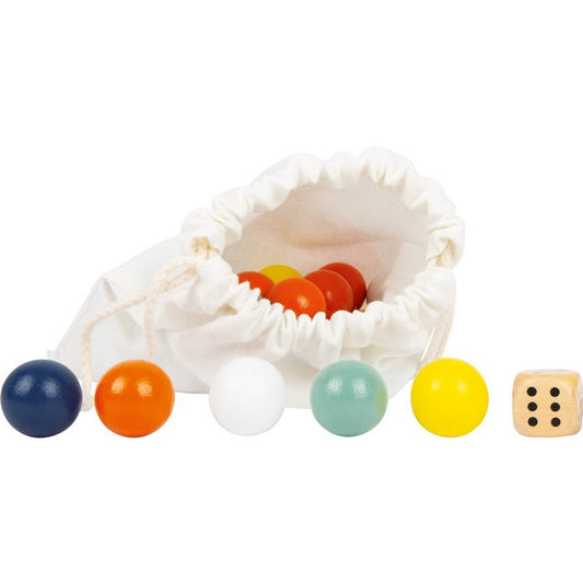 Met stoffen zak. Leuk voor kinderen, ouders en grootouders! Wie heeft het onder de knie en blokkeert de weg voor de andere spelers? Een dobbelsteen bepaalt de voortgang van de gekleurde houten ballen. De elf witte ballen en vijf ballen in de kleuren oranje, mintgroen, geel en blauw kunnen veilig worden opgeborgen in de meegeleverde stoffen tas. Dit klassieke spel staat garant voor veel speelplezier en mag in geen enkele spelkast ontbreken.