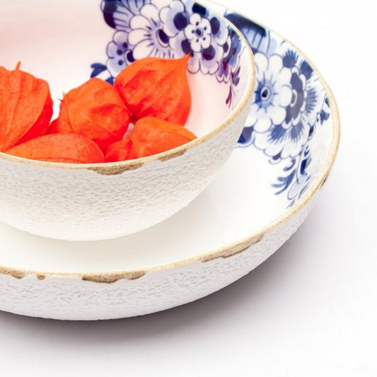 Hierdoor komen de texturen en de Delftsblauwe decoraties goed naar voren. “Normaal gesproken zitten er op Delfts blauw serviesgoed grote decoraties. Maar ik wilde er juist kleine delen uithalen en deze plaatsen aan één zijde van het aardewerk. De decoratie kruipt als het ware uit de rand.