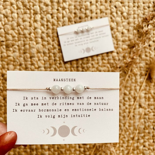 De armbandjes zitten verpakt om een kaartje waar de werking in affirmatie vorm op staat.