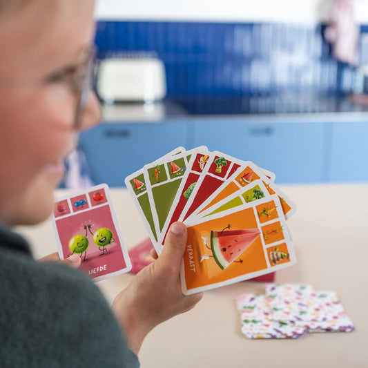 36 emotiekaarten, 9 sets: blij, boos, bang, verdrietig, verlegen, rustig, verrast, walging en liefde, 4 actiekaarten en spelregels