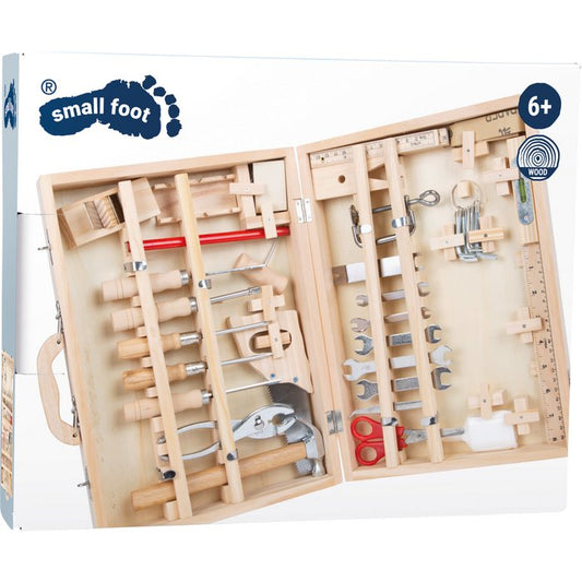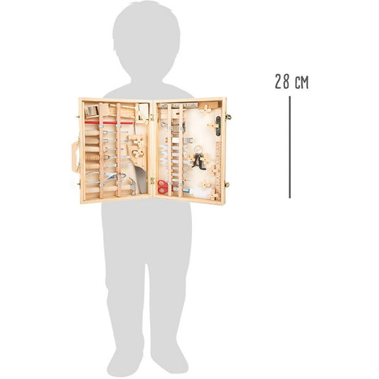 De ultieme gereedschapskoffer: opvouwbare houten koffer met 48 onderdelen voor kleine doe-het-zelvers! Voor elke koffer is het juiste gereedschap inbegrepen - van een liniaal en timmermanspotlood tot verschillende sleutels, dopsleutels en inbussleutels tot een hamer, zaag en beitel! Elk item in de koffer heeft zijn eigen plaats en is beveiligd zodat er tijdens het transport niets door elkaar werkt. Onmisbaar voor kleine vakmensen in de metaal- en houtsector!