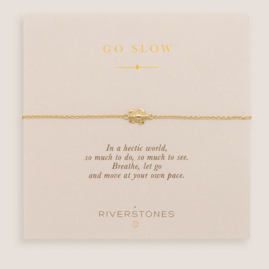 Neem de tijd om naar je intuïtie te luisteren. Trek je terug in jezelf zoals een zeeschildpad dat in haar schild doet. Er zijn zoveel meningen en adviezen om ons heen dat het gemakkelijk is om je daarin te verliezen. Zoek bewust de stilte. De wijsheid zit in jezelf. Dat is de boodschap die we je willen meegeven met de Go Slow armband.