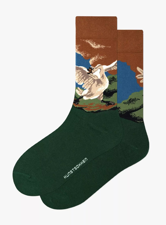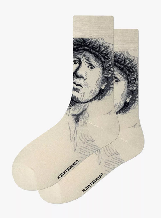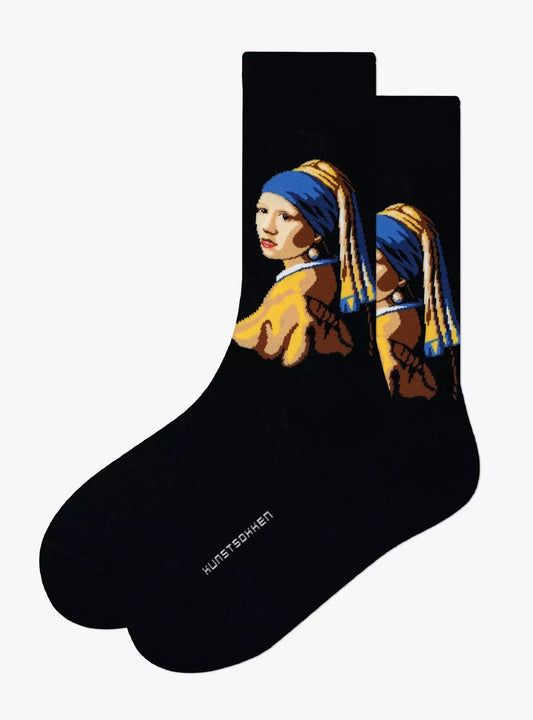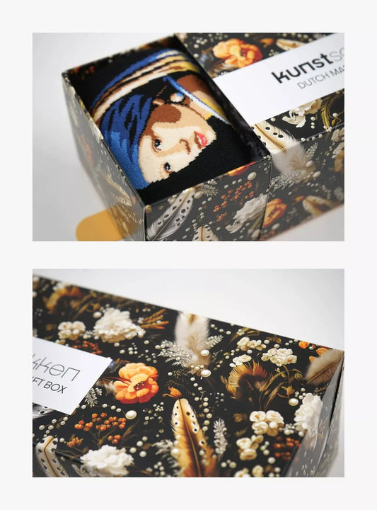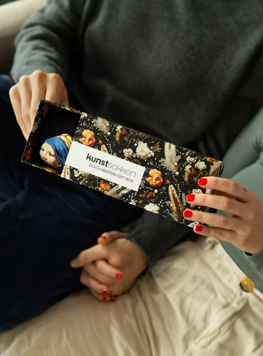 De stijlvolle verpakking is met zorg ontworpen om de tijdloze schoonheid van de Hollandse meesters te vieren en brengt de rijke details van de sokken prachtig naar voren.