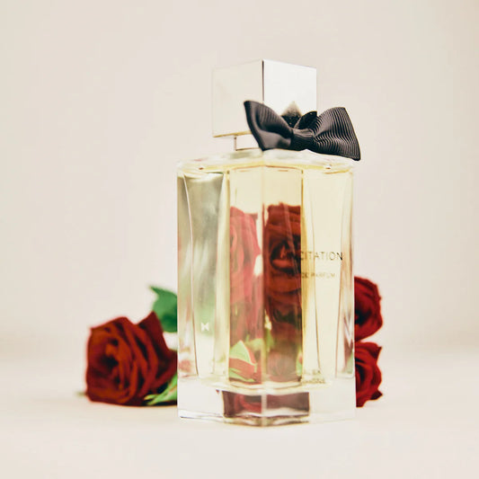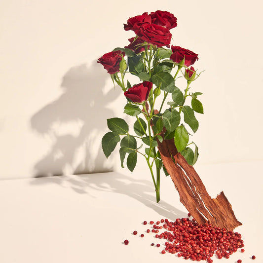 Middernacht, het uur van sensualiteit, ontmoet een gedurfde karmijnrode roos doorboord met roze peper. Het fluweel van gecombineerd en bloemblaadjes omarmt een hart van donkere en vurige wierook, voordat het bezwijkt aan het vleselijke magnetisme van spiegel en labdanum. Van mysterie naar verlatenheid, een opwindende dualiteit voor een ontmoetingsplaats.