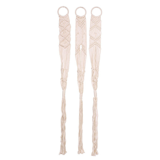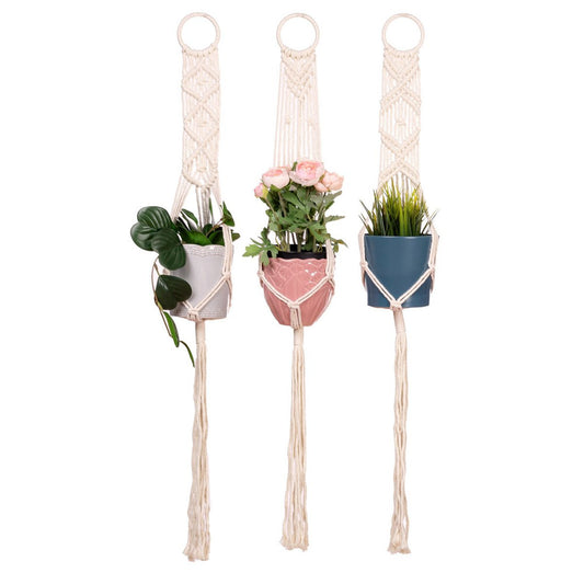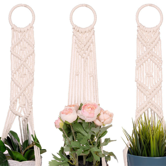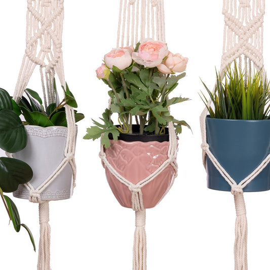 Potten en planten zijn niet inbegrepen. set van 3 hangers van gevlochten touw in macramé-stijl, metalen ring
