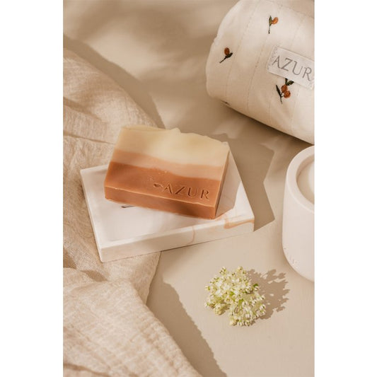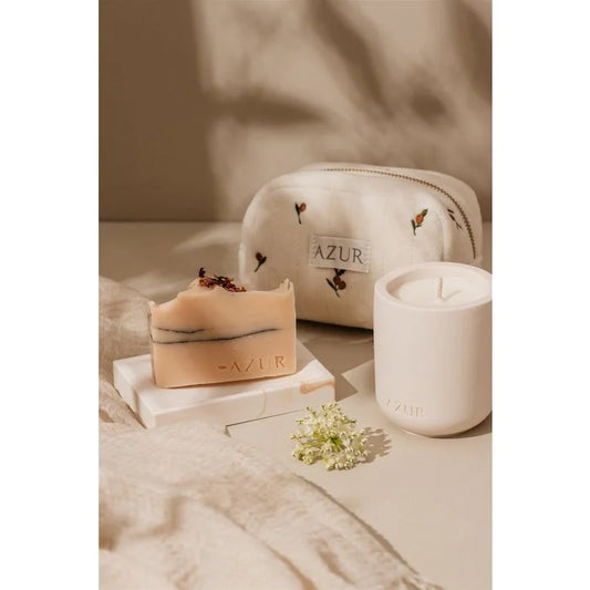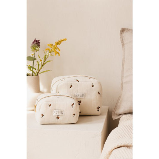 Exclusive, handmade Azur makeup bag. The pouch is made from super-soft cotton velvet and is embroidered with charming little oranges. It is finished with a golden zipper. The bag features one large compartment with two side pockets on the inside, helping you keep everything wonderfully organized! Size: 15 cm x 8 cm x 11 cm. Completely plastic-free.