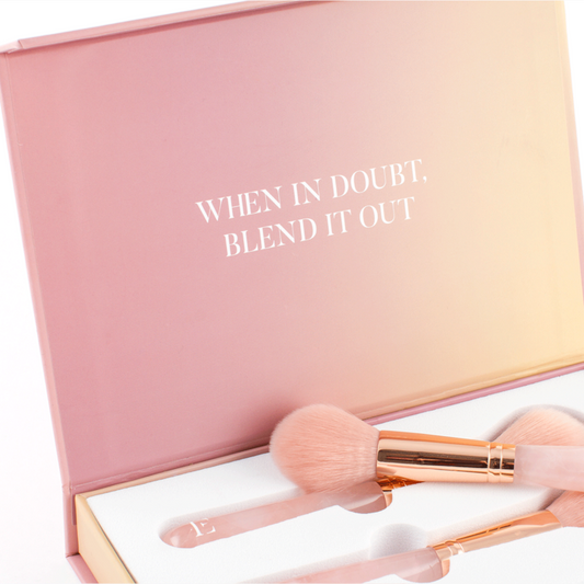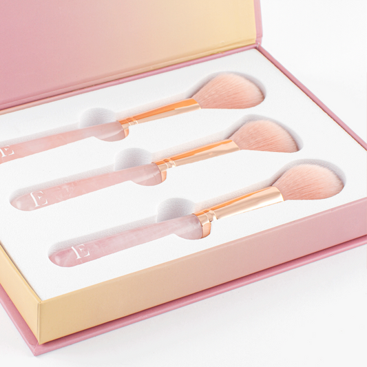 De BASF haren voelen zacht aan op de huid en zijn aangenaam om te gebruiken, terwijl de rozekwarts handvatten zorgen voor een luxueuze uitstraling. De borstels zijn per drie verpakt in een mooie luxueuze doos met een leuke quote aan de binnenkant. Een echte eye-catcher.