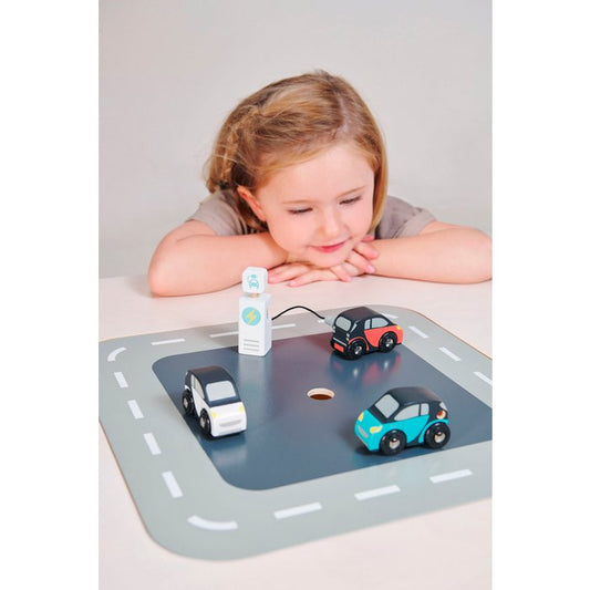 Tedere bladtransport: Auto's Eco 15x7x8cm, Set ontmoette 3 Elektische Auto's en een laadunit, in thous, in doos, 18m+