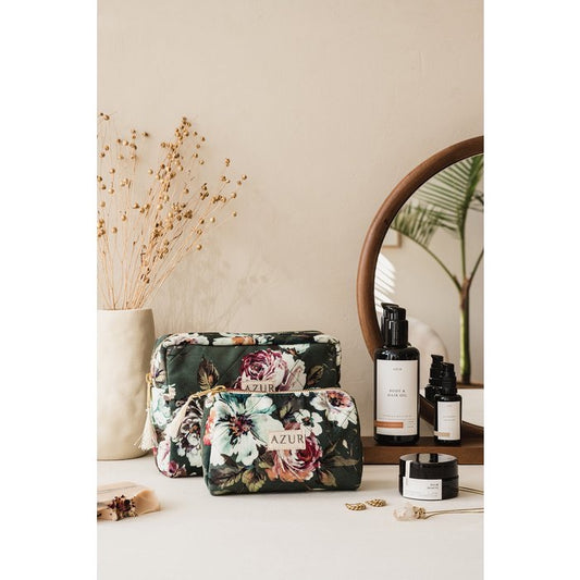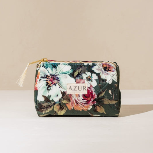 Exclusieve, handgemaakte Azur make-up tas. Het tasje is vervaardigd van stevig katoenfluweel en is bedrukt met een een prachtige bloemenprint. De tas is afgewerkt met een metalen YKK ritssluiting. De tas heeft één groot compartiment, met twee zijvakken aan de binnenkant. Zo hou je alles heerlijk georganiseerd!