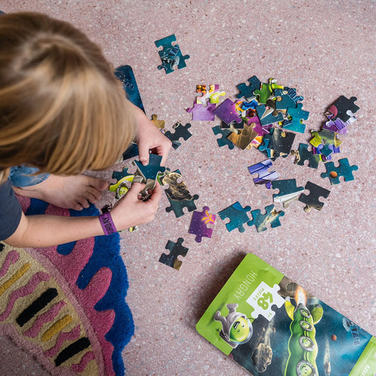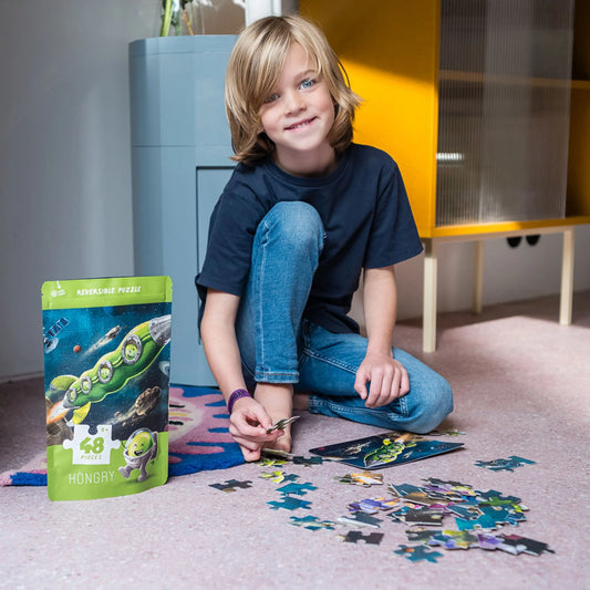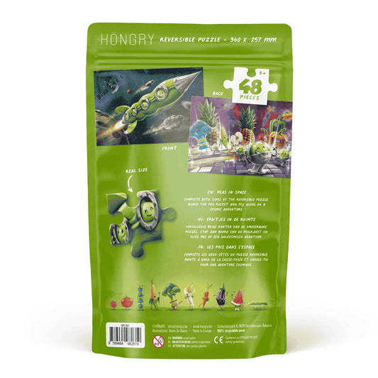 Vervolledig beide kanten van deze omkeerbare puzzel en stap aan boord van de peulraket. Samen vlieg je mee op een dolkosmisch avontuur vol fantasie, kleur en ontdekkingen.