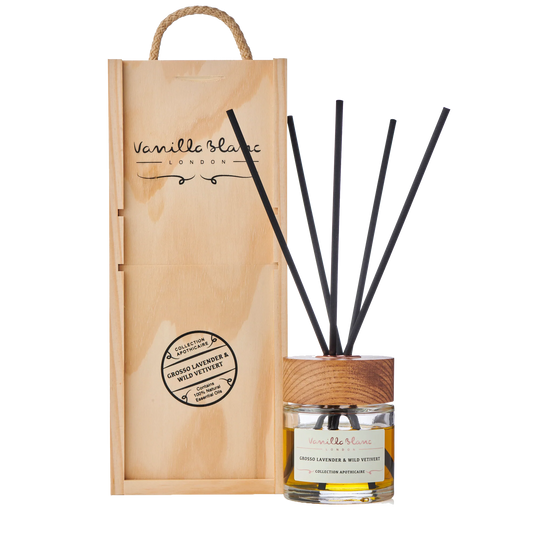 Natuurlijke rietverspreider ingekapseld in onze handgemaakte Signature® houten geschenkdoos.