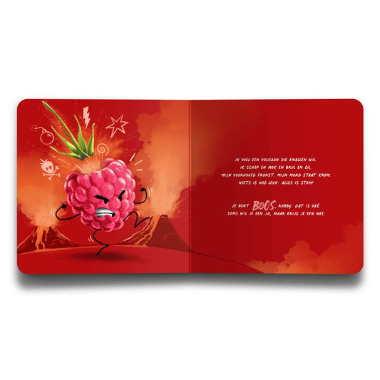 Ik ben Robby, Robby Framboos. Kijk eens hoe ik lach, huil en bloos! In dit lieve en fantasierijke kartonboekje voel je samen met Robby duizend-en-een emoties en leer je op een speelse manier emoties te herkennen en benoemen.