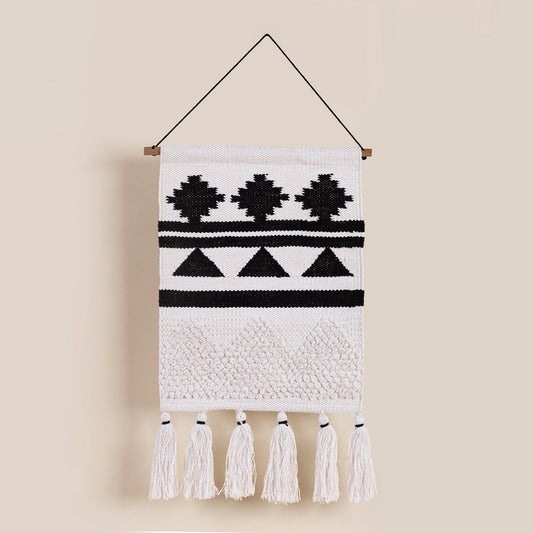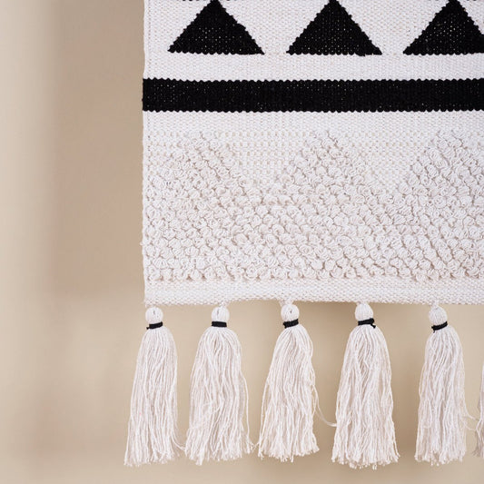 Voeg textuur en een boho-noot toe aan de inrichting van het huis, balkon of terras met dit katoenen gevlochten wandtapijt.