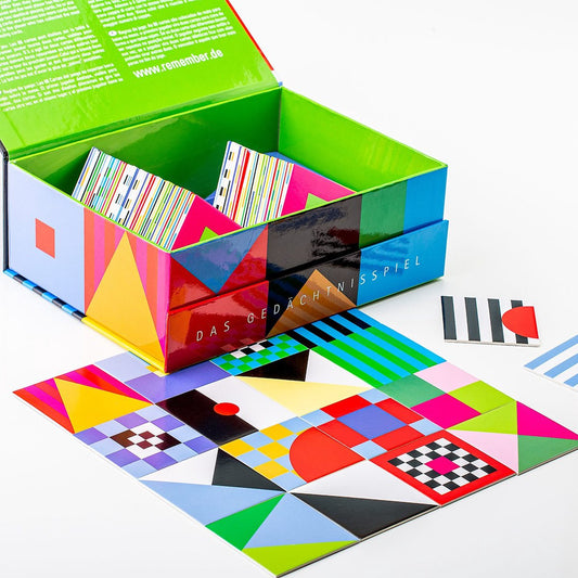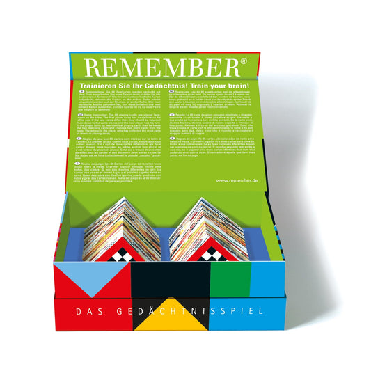 Memory van Remember. Memoryspel met als thema patronen. Origineel spel met kaartjes die je bij elkaar moet zoeken. Het Remember memory spel bevat 44 sets met kaarten die bij elkaar gezocht moeten worden. Wordt geleverd in een hoogwaardige doos met magnetische sluiting. Afmeting kaartje: 5,6 x 5,6 centimeter.