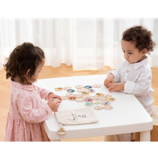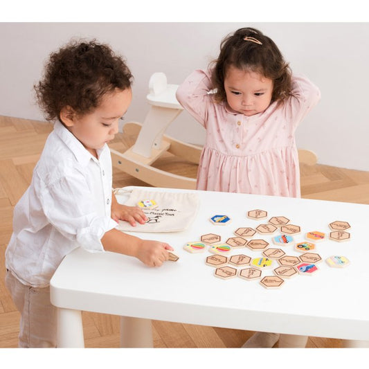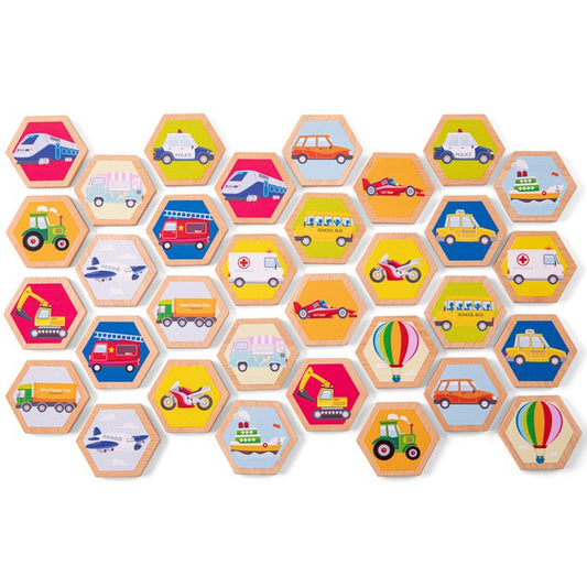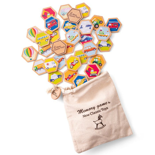 Dit houten geheugenspel van New Classic Toys is het perfecte spel voor familie en vrienden. Het spelen van dit spel is een uitstekende activiteit voor het ontwikkelen van fijne motoriek, probleemoplossend vermogen en het trainen van uw geheugen. Moedigt sociaal spel aan terwijl kleintjes herkennings- en spraakvaardigheden ontwikkelen. Spelregels: leg de tegels met de afbeelding naar beneden en draai om de beurt twee tegels om. Als je een match maakt, mag je de twee tegels behouden, anders draai je ze weer om. De truc is om te proberen te onthouden waar de verschillende voertuigen zijn, zodat je een paar kunt maken. Degene met de meeste tegels (paren) aan het einde van het spel wint. Er zijn 16 paar (32 stuks) met voertuigen geïllustreerde houten tegels die bij elkaar passen en verzameld kunnen worden in dit klassieke spel. Wordt geleverd met een katoenen tas voor eenvoudig opbergen. Dit geheugenspel is gemaakt van FSC® 100% -gecertificeerd hout.
