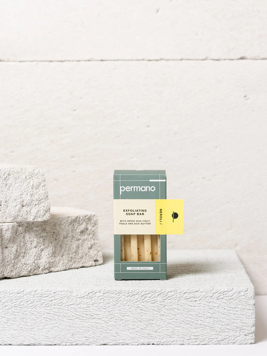 All the benefits of our exfoliating cleanser, now in a solid, travel-friendly and more sustainable format. Rub the bar of soap into damp hands and gently lather until the exfoliating particles have slipped away. Rinse and enjoy the bright smell of neroli. Permano is 100% Made in Italy with the best natural ingredients, paraben-free and nickel-tested.