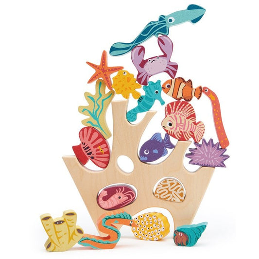 Dit kleurrijke en fantasierijke stapelspel is een ware blikvanger. De verschillende vormen van marien leven in levendige tinten nodigen kinderen uit om hun motorische vaardigheden en fantasie te ontwikkelen.