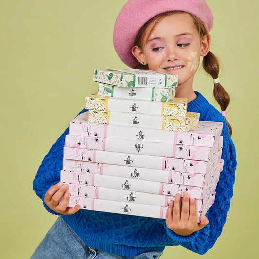 Verpakt in luxe kartonnen doosjes met spiegel, magneetsluiting en unieke prints is TOOT! make-up een feest om cadeau te krijgen!