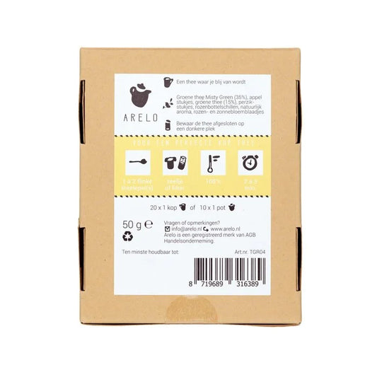 Groene thee Misty Green (35%), appelstukjes, groene thee (15%), perzikstukjes, rozenbottelschillen, natuurlijk aroma, rozen- en zonnebloemblaadjes