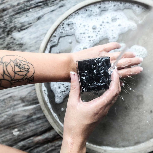 Schuim zeep in de handen met warm water en masseer op gezicht of lichaam. Door de zeep ontstaat een zwart schuim dat met water kan worden afgespoeld